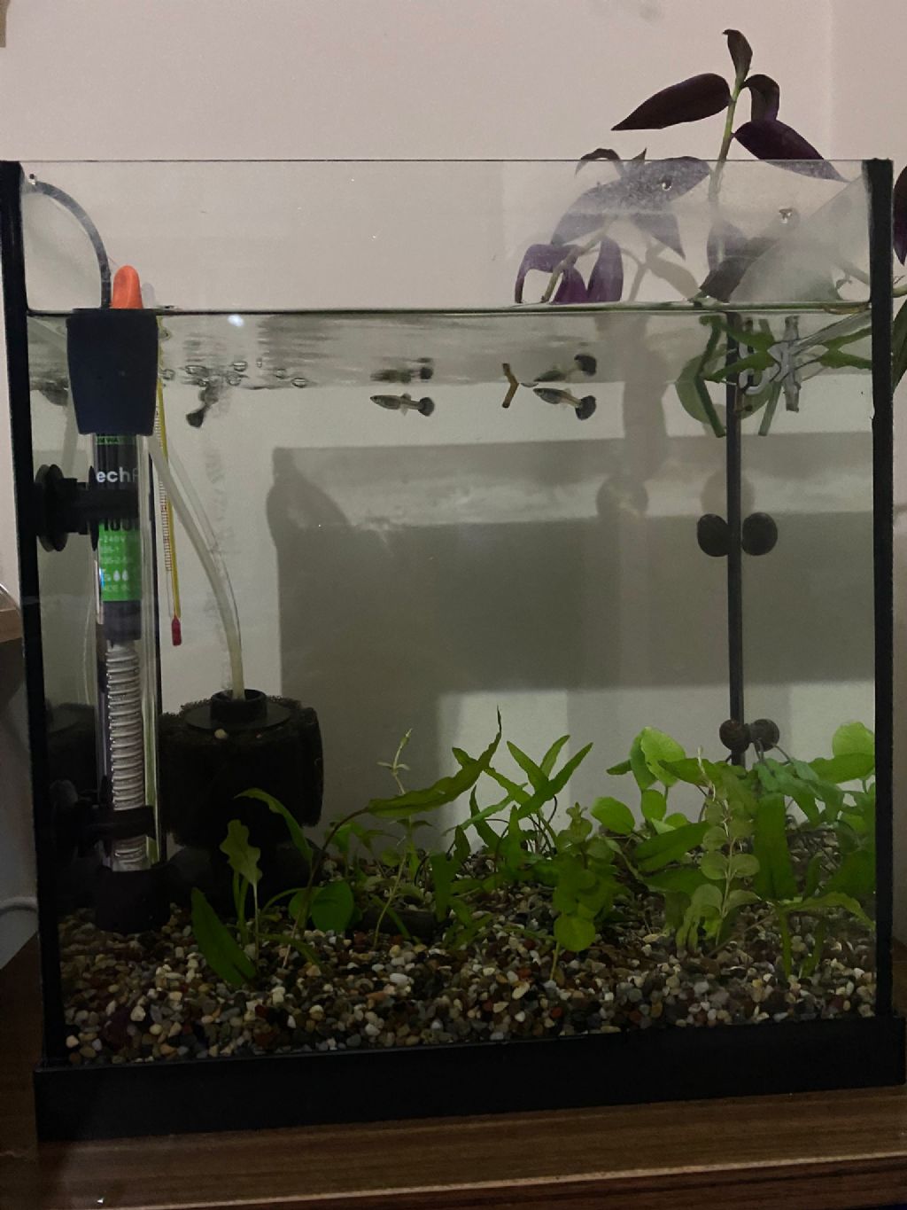 25derece su ısısı Canlı Türleri: 3 Dişi Lepistes 2 Nerite salyangoz Su üstü: tradescantia,pothos Su altı: cryptocoryne green,subulata,anubias ve ismini bilmediğim nummularia aureaya benzeyen bitki