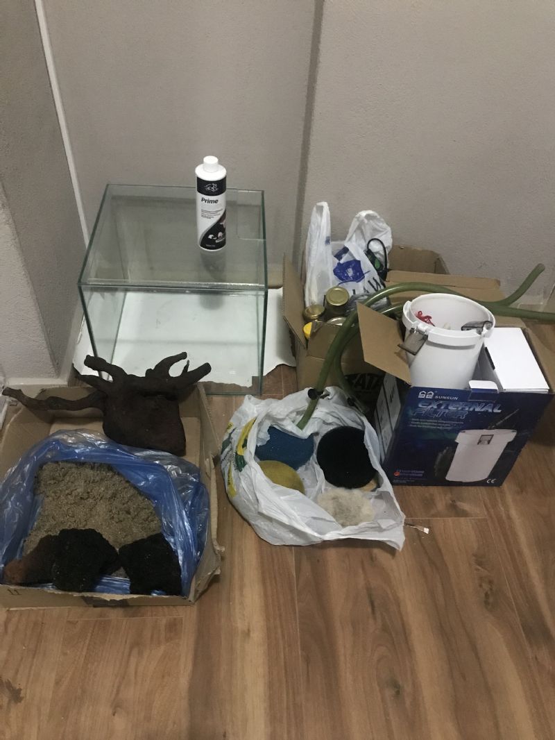 Satılan Malzeme(ler): 35x35x30(h) akvaryum (buhar camı vardır), tetra 25w ısıtıcı, sunsun 603 b filtre, dophin h200 şelale filtre, mangrıw kökü, anubias glabra(3 kök), seachem prime, kum, lav kayası (3 adet)