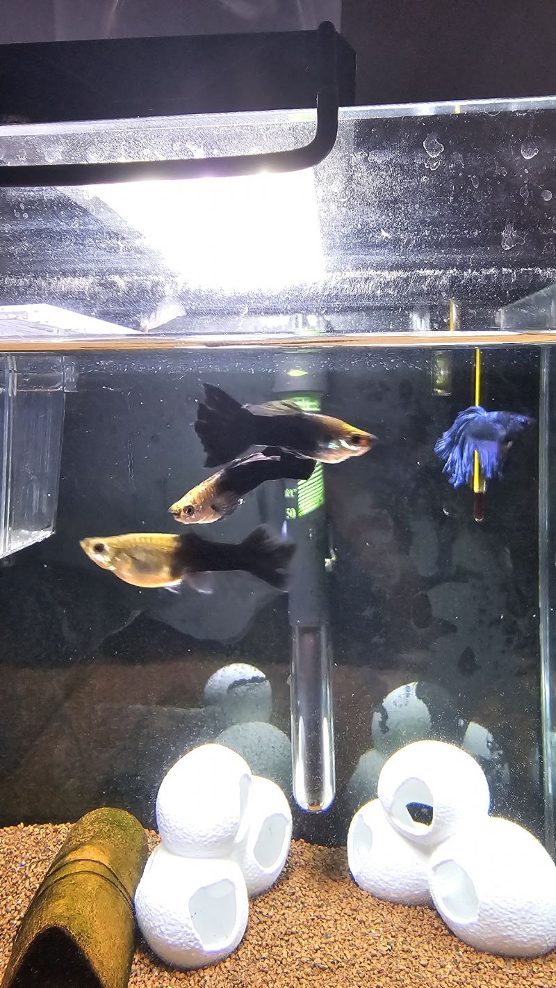 Sürekli yavruladıkları için yetişkin olanları elden satıyorum. Dişiler de erkekler kadar gösterişli kuyruklara sahipler. Kuyruktan dişi-erkek ayrımı yapılamayacak derecede. Benimkiler sürekli didiştiklerinden kuyrukları biraz yıpranmış durumda. Daha kalabalık ve saklanma yeri olan akvaryumda daha iyi olurlar.