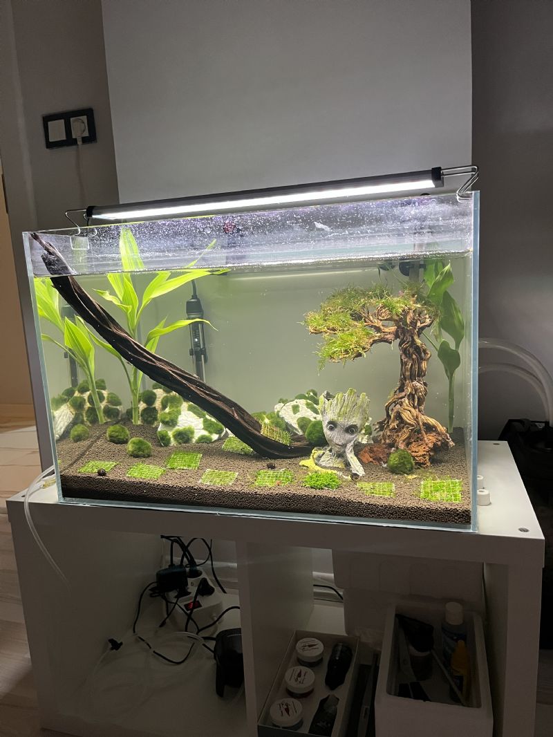 Diğer Ek Bilgiler: Eden 522 dış filtre, oase soil 9L bitki kumu, kök, moss kaplı kayalar, orion led b50 armatür. isteğe bağlı 40+ çeşitli renk ve boylarda karides, 5 adet 5x5 tele sarılı moss, 2 adet 4cm marimo moss topu, akvaryum için sehba