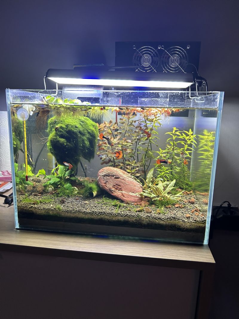 Özenle kurulmuş bitkili 40 litre akvaryum 40x31x29h ölçülerinde bakteri kültürü oturmuş haldedir.