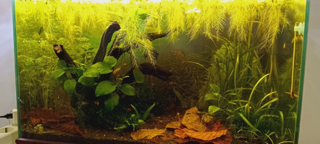 Yeni bir kurulum, moss türlerini çok sevdiğim için karidese de geçebilirim diye düşünmüştüm, ama ölçü beni biraz kısıtladı açıkçası, ilk gün ölçümlerinde ro su ile kurulum yaptığımdan dolayı 9 ppm ile başladık, 200 litrelik akvaryumumun sumpından bakteri kültürü alarak kuruluma başladık, ppm i mineraller ile 150 civarına getireceğim, bakteri kültürünün oturmasını hızlandırmak için bir elma salyangozu ekledimde farkettim ki ışık şiddeti canlıları rahatsız ediyor, o yüzden pipo filtrenin akıntısına ya dayanabilecek bir su üstü bitkisi yada bir su üstü bitkisi tutucu yaptıracağım, karidesde 15 adet bloody mary ekleyeceğim, önerisi olan varsa konuma beklerim.