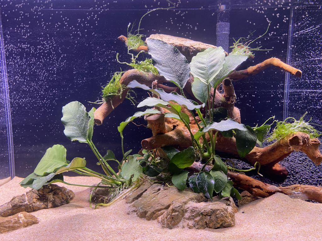 Akvaryumun ilk kurulum aşamasında 2 kök büyük yapraklı Anubias Barteri. Barteri'yi çok ön plana yerleştirerek hata yaptığımı düşünüyorum ama bu bitkileri kök ve taşlara yapıştırmıştım. Oldukları yerden söksem bitkilere zarar gelir mi?